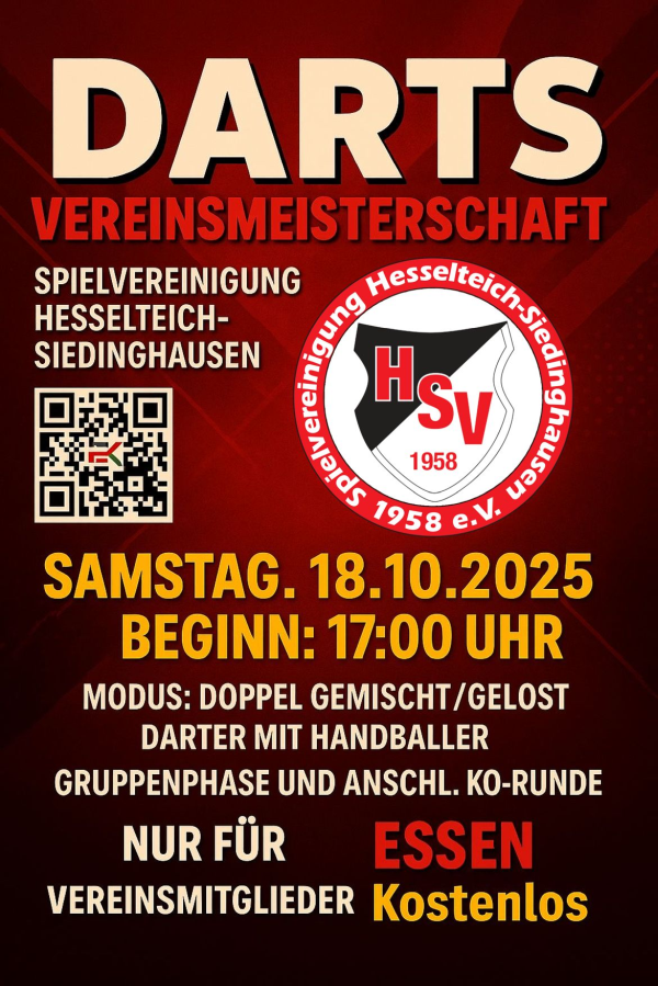 am 18. Oktober wollen wir die jährliche Darts-Vereinsmeisterschaft veranstalten. Und wir wollen sie zu einer "Vereinsbegegnung" machen und die Abteilungen Darts und Handball - die logischerweise unterschiedliche Qualitäten am Dartsboard haben - zusammenführen. Daher wird es ein Doppel-Turnier geben, wo wir Handballer und Darter gemischt in ein Team losen.