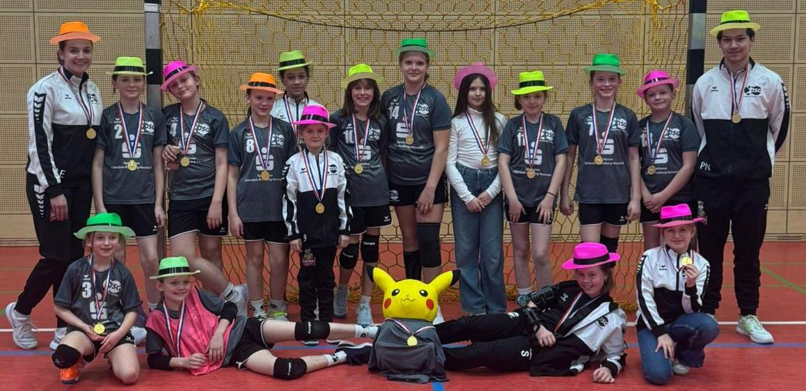 Die weibliche E1 der JSG Hesselteich-Loxten sicherte sich souverän Platz eins in der 1. Kreisklasse. Die Mannschaft von Alexandra Eppe, Paul Nathmann und Jule Kirchhoff ging in allen Spielen als Sieger vom Feld und konnte auch beim Vielseitigkeitstest punkten. Dafür gab es zum Abschluss Medaillen, Kuchen, Getränke und bunte Hüte.Stehend: Trainerin Alexandra Eppe, Alina Patz, Charlotte Kußmann, Mira Borgmann, Leya Scholz, Emma Bredemann, Emma Erdbrügge, Johanna Erdbrügge, Frieda Enders, Finja Kirchhoff, Lenya Großeknetter, Maylin Kosecki, Trainer Paul Nathmann